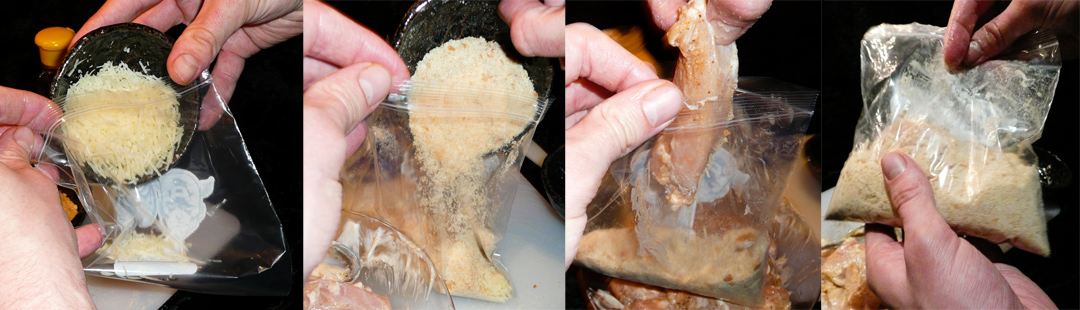 Fill a Zip-lock bag with the Parmesan and breadcrumbs and shake them around so they mix evenly. Shake each chicken strip one by one in the bag so the breading sticks to them.