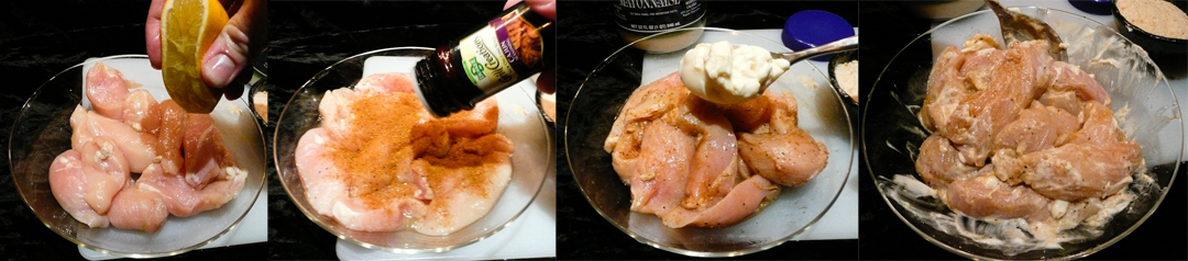 Create a marinade for the chicken by putting the meat in a bowl, then squeezing the lemon juice, Cajun seasoning and mayonnaise. Mix it all around and let the flavors absorb (approx 5 minutes).
