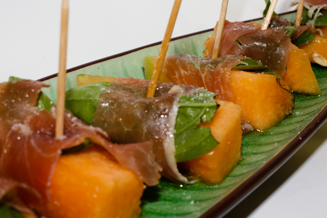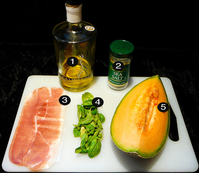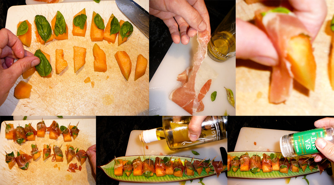 Spread out the cantaloupe chunks and lay a basil leaf atop each. Pull away strips of prosciutto and wrap them around the basil and cantaloupe. Secure with toothpick, drizzle with olive oil, and sea salt.