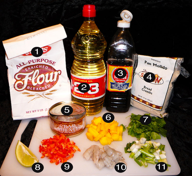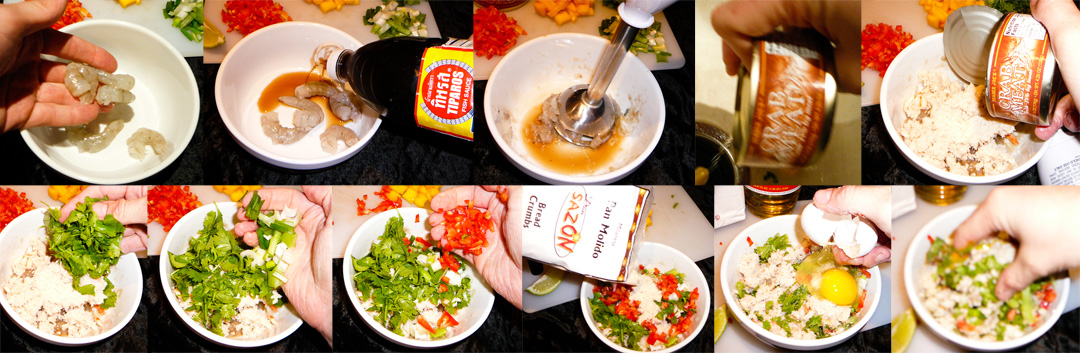 Combine the shrimp and fish sauce and puree.  Drain the water, and then dump in the crab.  Add the cilantro, green onions, bell pepper, breadcrumbs, and eggs. Mix together vigorously.