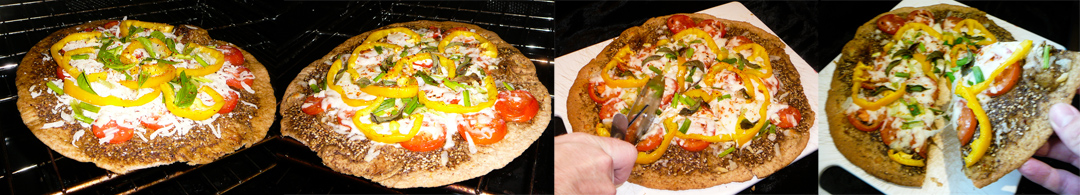 Throw the pizza in oven and bake until the pita crust hardens and cheese melts (approx 10 min). Cut it like pizza slices and serve up like