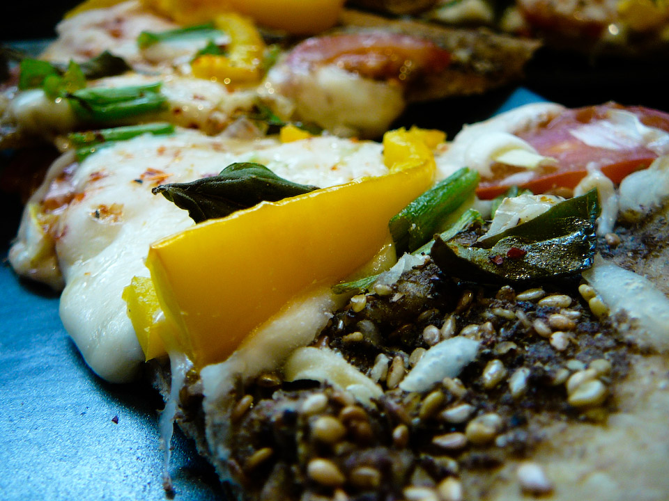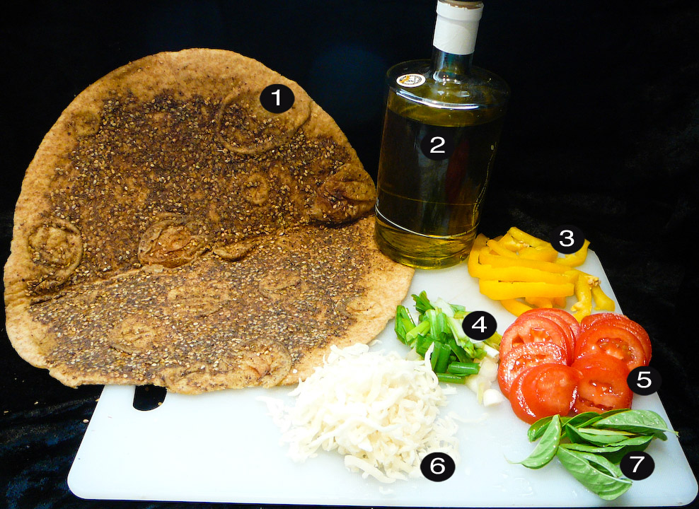 Preheat your oven to 350°F/175°C. Pour the olive oil over the pita and rub it in. Place the tomatoes evenly throughout the pita. Scatter the mozzarella evenly over the tomoatoes. Finally scatter the green onions, yellow bell peppers and basil over it all.