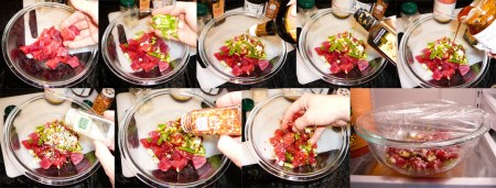 Throw the ahi into a bowl and combine with the green onions, soy sauce, sesame oil, honey, sesame seeds, and crushed red pepper. Mix together and refrigerate until cool (approx 1-2 hrs).