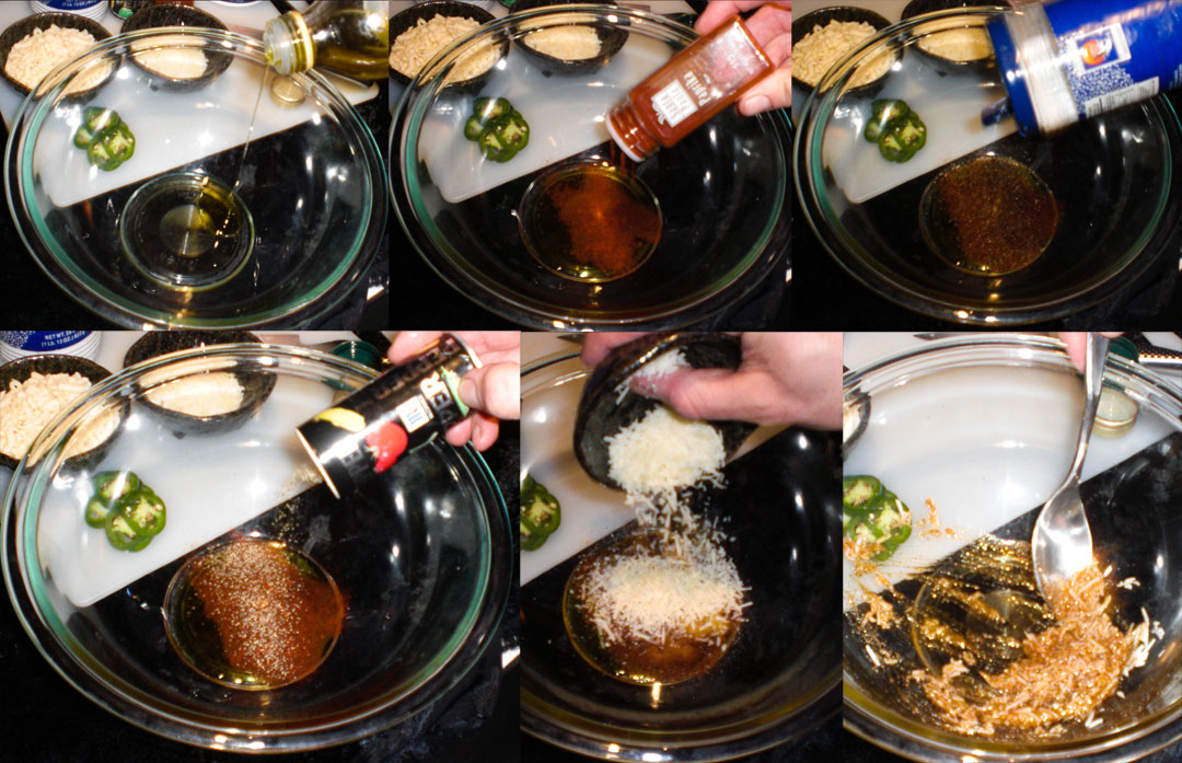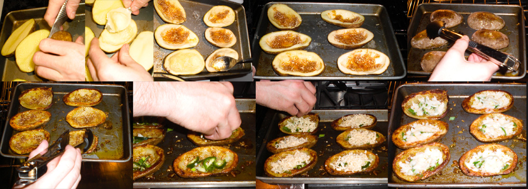 Wash the potatoes thoroughly, and then cut them in half and scoop out the centers with a spoon, leaving the skins in tact. Place the 6 potato skins in a greased baking pan, apply the glaze evenly over all and toss them in the oven to bake (approx 7 minutes). Pull the pan out of the oven and flip the skins over and bake until they brown (approx 7 minutes). Flip the skins back over and throw in the jalapeños (and green onions if you wish) and cover them with cheese. Toss the skins back in the oven until the cheese melts (approx 2 minutes). Serve those bad boys up on a plate with sour cream and if you are feeling bold, GUAPO GRINGO GUACAMOLE.