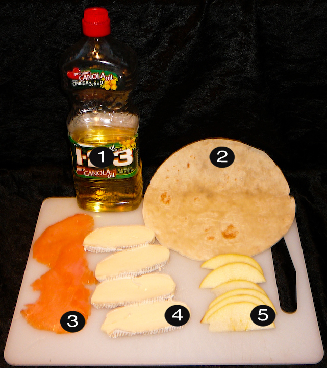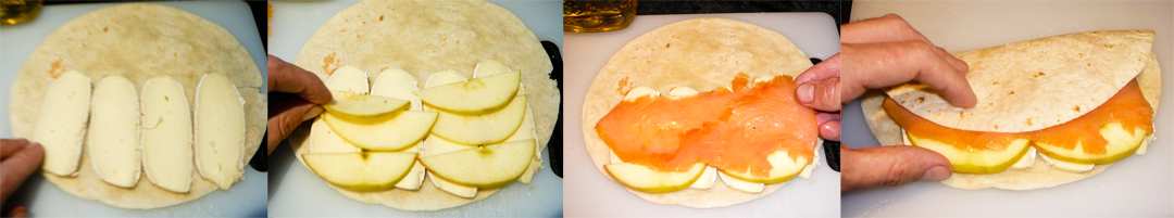 Lay out the Brie, apple, and lox over the bottom half of the tortilla. Fold shut.