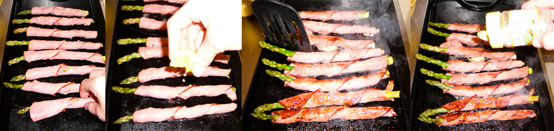 Warm up the griddle or pan on medium heat. Throw the bacon-wrapped asparagus in and cook, squeezing the lemon juice over as the bacon starts to sizzle. Cook until the down side of the asparagus browns (approx 3 min) before rolling them over. Salt the other side and cook the other side until it browns (approx 2 min).