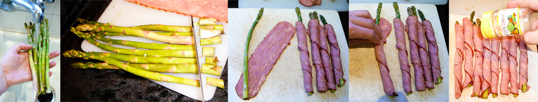 First wash the asparagus and cut 1 inch off the bottoms. Wrap the asparagus in bacon at an angle tightly. Salt as you wish.
