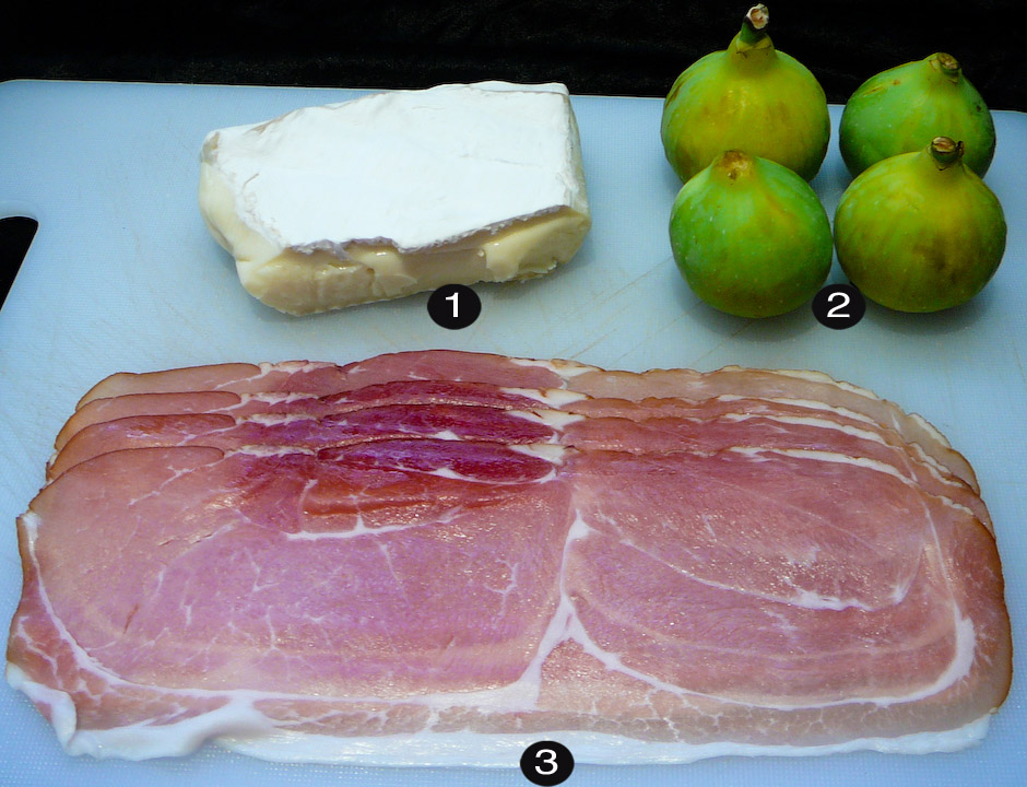 Quarter the figs and add small slices of Brie to each section. Pull off long strips of proscuitto and wrap each fig/brie unit. Serve up on a plate or laid across your naked body.
