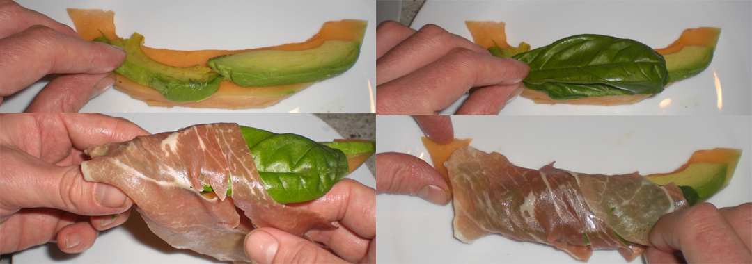 Place two slices of avocado on each cantaloupe slice. Place a basil leaf on top of the avocado. Wrap it up tight with the prosciutto at an angle to cover most of the melon slice.