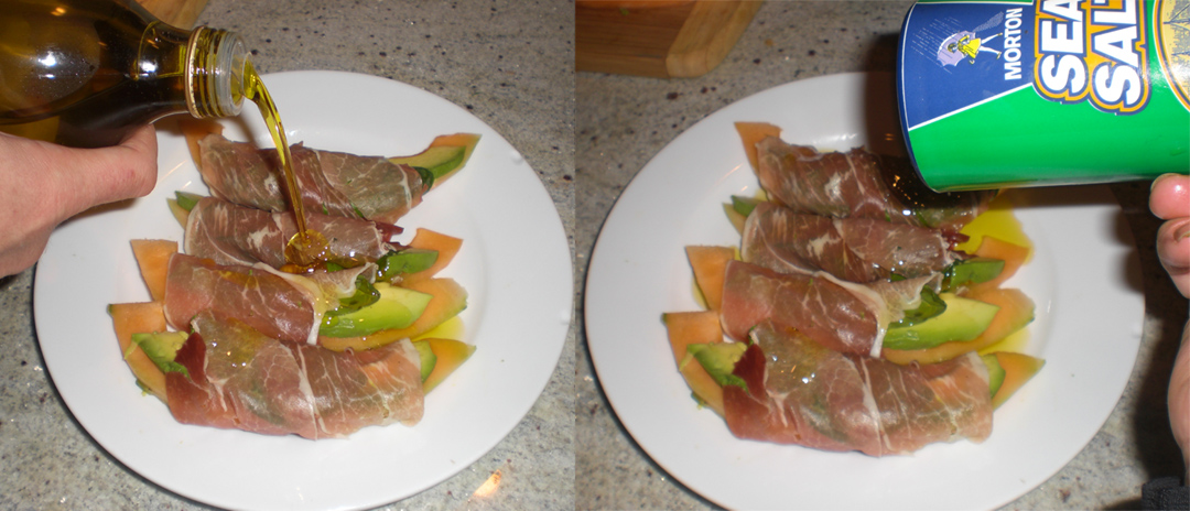 Put your wrapped cantaloupe slices on one plate. Pour olive oil over the lot then scatter some sea salt and serve it up. Who’s the player now? You are! Yes you can!