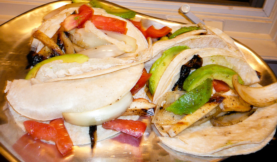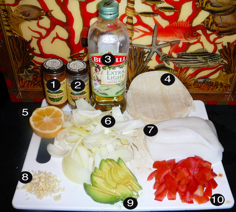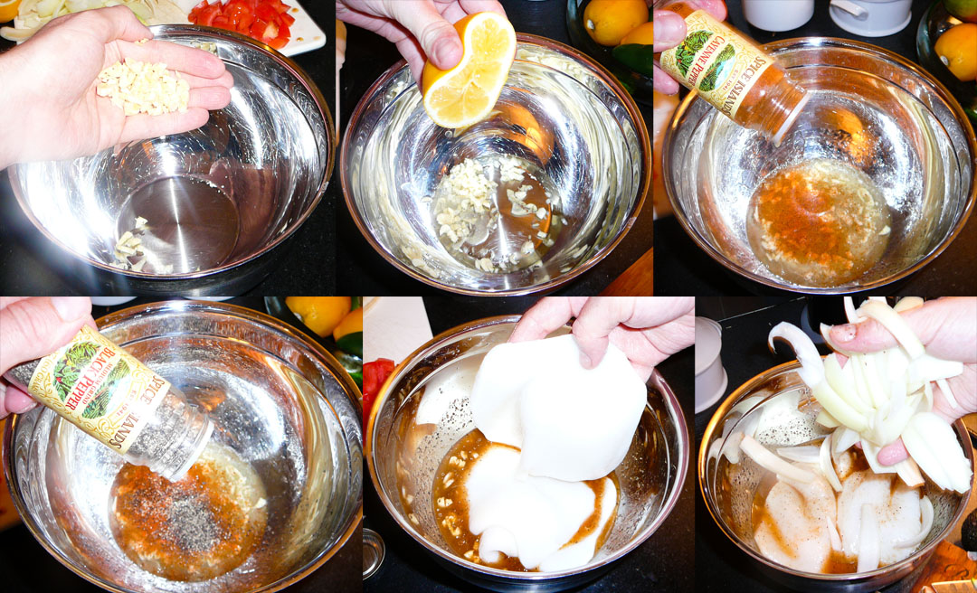 Wrap the tortillas in tinfoil and heat them in the oven at 200 degrees F. Create the taco marinade by combining the garlic, lemon juice, cayenne pepper and black pepper in a bowl. Throw in the calamari steaks and onions and allow the flavor to set in (approx 15 minutes).