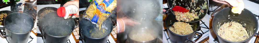 Boil the penne al dente, seasoning the water with olive oil and sea salt (approx 10 min).  While you wait for the pasta to boil, move onto Step 3.  When the pasta is ready, drain and mix it in with sautéed veggies in Step 3.