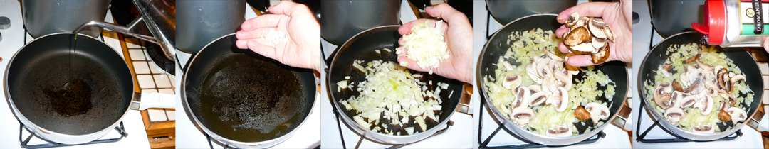 Sauté the garlic and onion with the remaining olive oil on medium heat.  Mix in the mushrooms and sauté it all with sea salt ½ tsp of salt until they are soft (approx 6 min).
