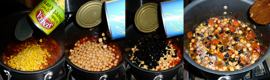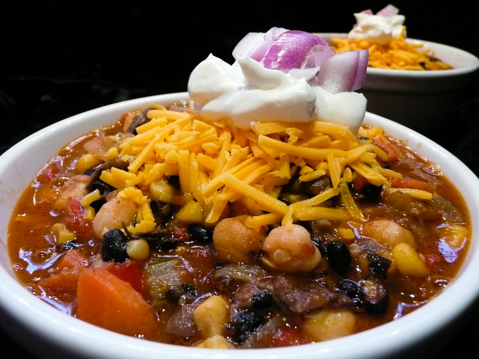 Drain the liquid from the cans of corn, garbanzo beans and black beans, then dump them all into the pot and cook them with all the other goodies until they become united in their chili power (approx 10 minutes). Serve up with a sexy selection of toppings like shredded cheddar, sour cream and diced red onions.