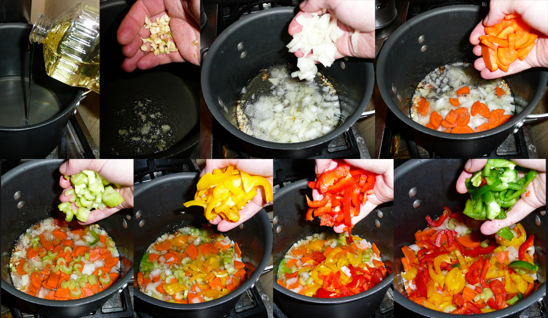 Heat up the vegetable oil in a stockpot on medium-high. Sautee the garlic solo until they brown (approx 30 seconds). Cook the onions until they become translucent (approx 2 minutes). Throw in all the carrots, celery, yellow, red and green peppers and cook until they soften, stirring occasionally. (approx 15 minutes)