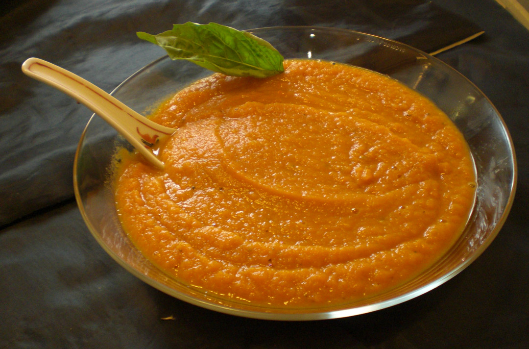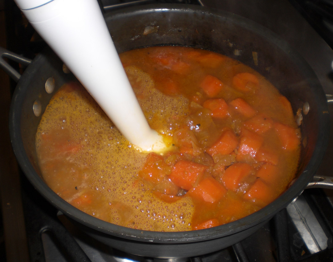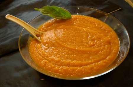 The veggies should have softened significantly. Puree the shit out of it preferably with a cooking wand or use a Cuisinart or blender so it all becomes a gorgeous, aromatic orange color. Salt and pepper as needed and serve with bread or perhaps a delicious sandwich. Did I mention it’s vegan?