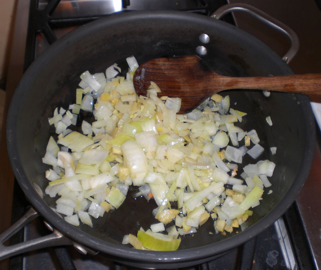Use a stockpot to sauté the ginger, garlic and onions in olive oil and cook down for 10 minutes.