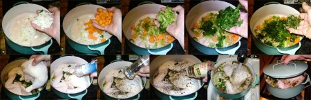 Create the broth by combining in a stockpot half the onions, carrots, celery, parsley, thyme, all the chicken and a dash of sea salt, black pepper, and red pepper flakes. Fill the stockpot with water until ingredients are all submerged. Bring to a boil, and then lower heat to medium and cook for 1 – 1 1/2 hours.