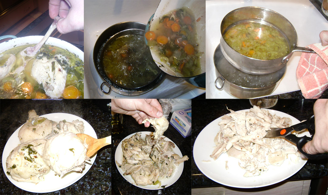 The stock will be ready when the chicken falls off the bone when you pick it up. Remove the chicken and allow to cool. Use a colander or steamer to drain the broth, discarding the veggies. Once cool, remove the chicken skin and bones, and then break the chicken into small pieces.