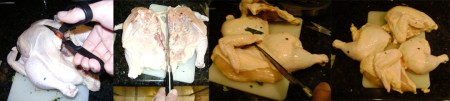 Prep the chicken by cut open the breastbone, cutting away the spine, and quartering it.