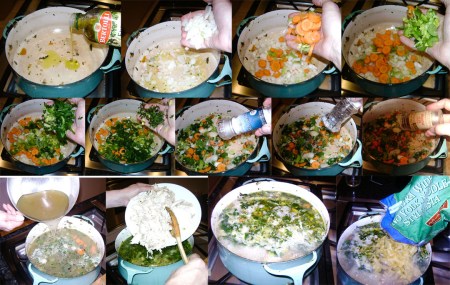Sauté the remaining veggies in olive oil, spicing it with more sea salt, black pepper, and red pepper flakes (approx 5 min). Add the stock, chicken, and bring to a boil. Pour in the egg noodles and cook through (approx 20 min).