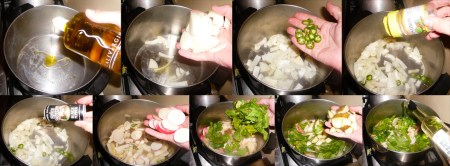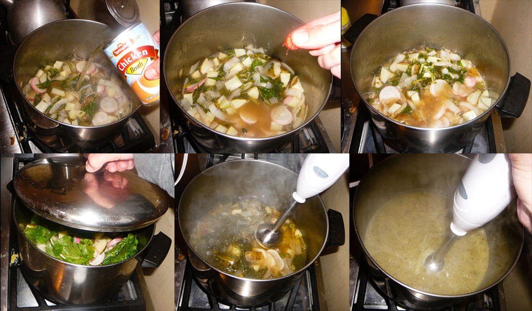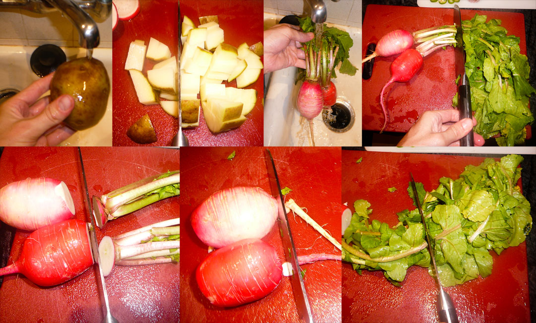 First rinse the potato thoroughly and chopped coarsely. Wash the radish, cut away and discard the stalks, but keep the leafy tops, coarsely chopped.