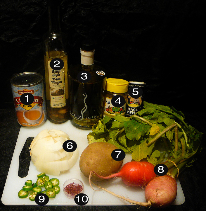 Heat up the olive oil in the pan on medium heat. Sauté the onions until they soften (approx 2 min). Add the jalapeño slices, spicing with salt and pepper (approx 1 min). Thrown in the radish slices, chopped leaves, and potatoes. Pour in the white wine vinegar, bring to a boil, and then simmer (approx 5 min).