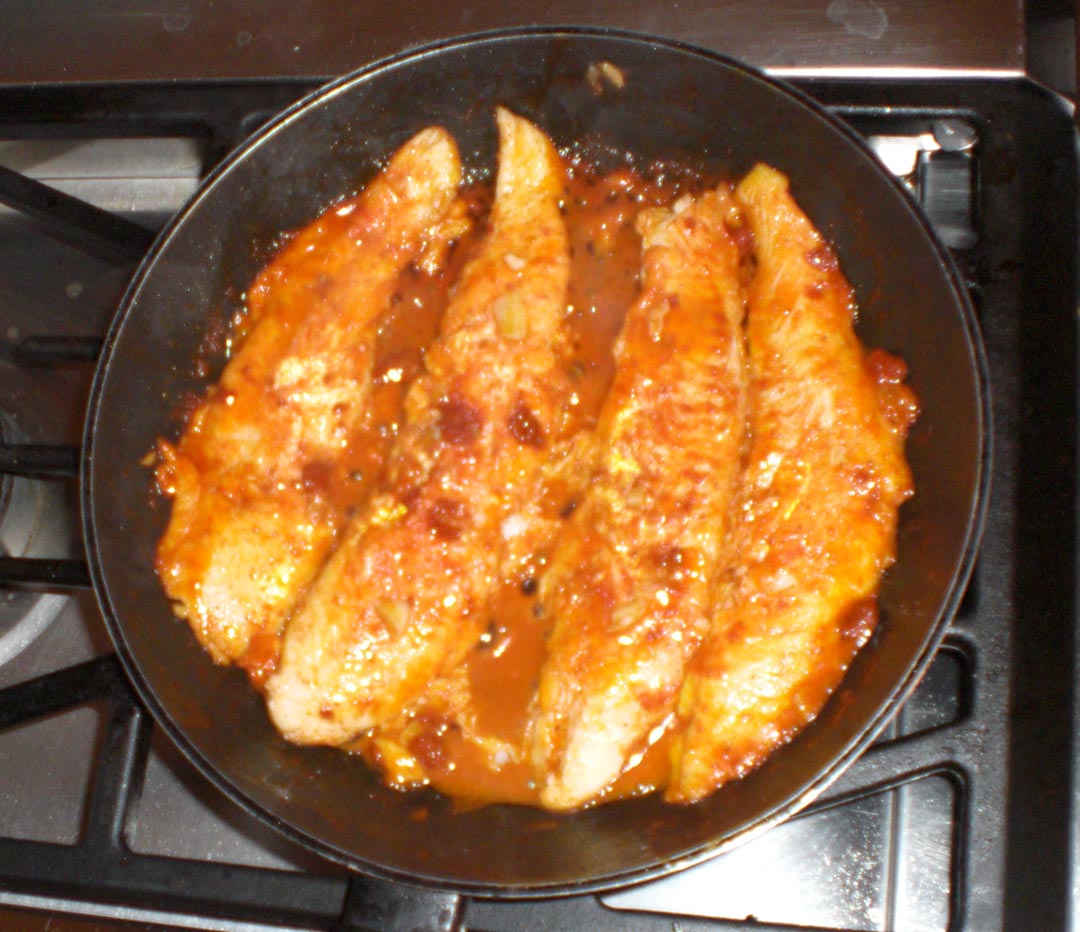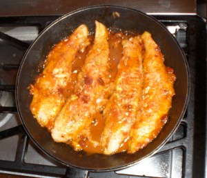 Cook the fish until the orange juice has absorbed into the fish filets. Now the fish serve over rice or a salad.