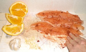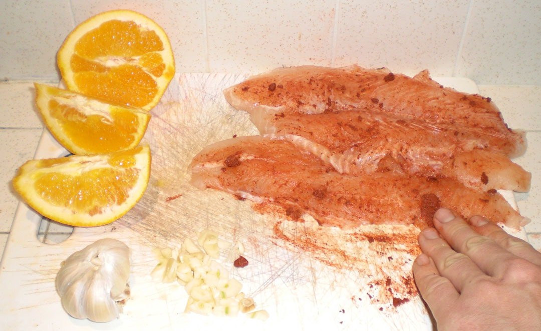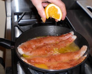 Put catfish fillets in the pan and squeeze the entire orange, pulp and all, into the pan. After a few minutes flip the filets so they cook evenly.