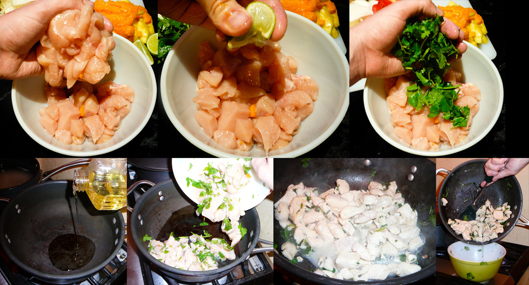 Marinate the chicken in lime juice and ½ the cilantro. Heat up 1 tablespoon of oil in a large deep pan on high heat and brown the chicken (approx 4 min). Set the chicken aside.
