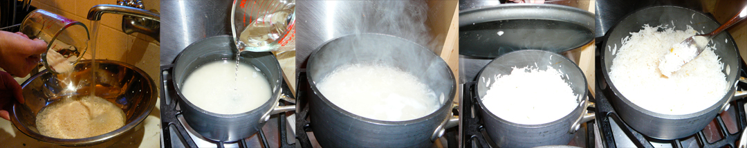 Wash the rice first in a colander. Then boil the rice with twice as much water. Turn the heat down low and simmer until the water is all absorbed (approx 15-20 min). Use a fork to fluff the rice after. Move on to Step 2 while it simmers.