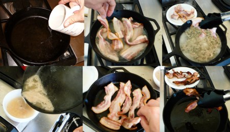 Preheat oven to 450°F/230°C. Blanch (save water for bouillon) then sizzle the bacon, leaving the grease in the pan at a low heat to sauté the vegetables.