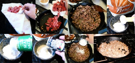 Paper towel blot the beef and brown in the same pan, then toss the beef with the salt, pepper, flour ménage a trois and put in oven for 10 minutes, tossing after 5 minutes.