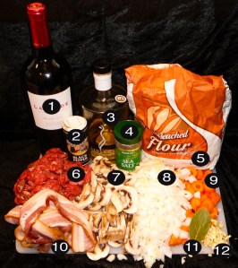 Reduce oven to 350°F/175°C. Add the wine and bacon water beef broth to the coated beef. Add the vegetables and crushed bay leaf and place in oven for 2 1/2 hrs while you work up an appetite.