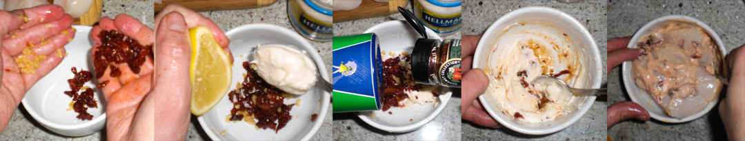 Create the scallop coating by mixing up the garlic, sun dried tomato, lemon juice, mayonnaise, salt and red pepper flakes in a bowl. Toss the scallops so they are coated evenly.