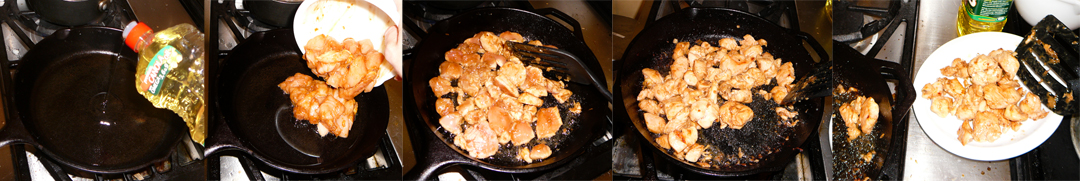 On medium heat pour vegetable oil in a pan and add the chicken. Cook through (approx 4 min), flipping as necessary and set meat aside.