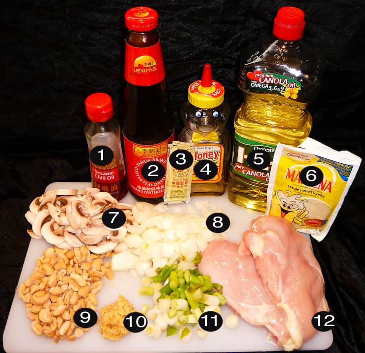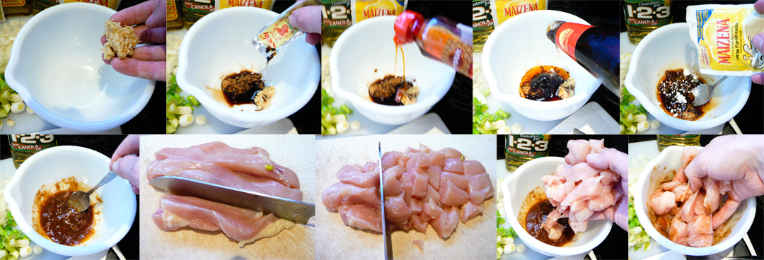 Mix up the ginger, soy sauce, sesame oil, oyster sauce, and cornstarch in a bowl. Cut the chicken into cubes, smother in the marinade, and allow the flavor to kick in (approx 15-30 min).