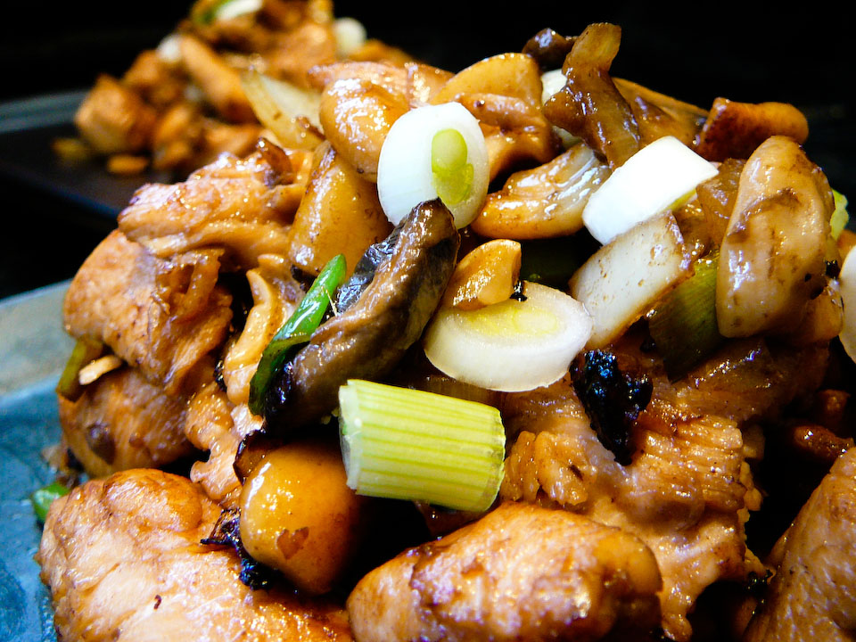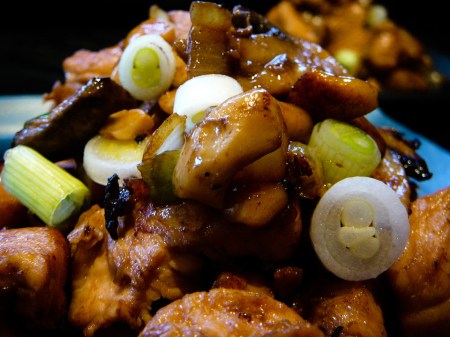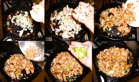 Use the remaining marinade in pan and mixing bowl. Throw the onions and mushrooms in. Cook until the onions get translucent and mushrooms go soft as a Eunuch at a strip club (approx 3 min). Add the cooked chicken, cashews, and 2/3 of the green onions. Heat through (approx 1 min).