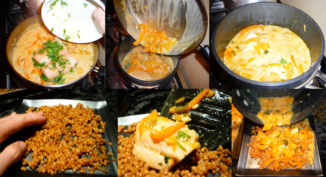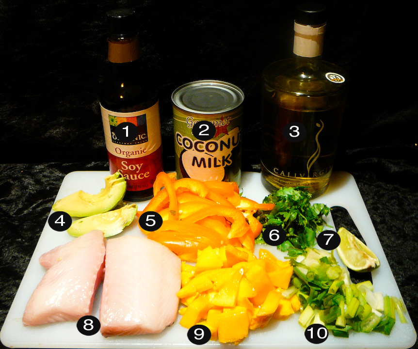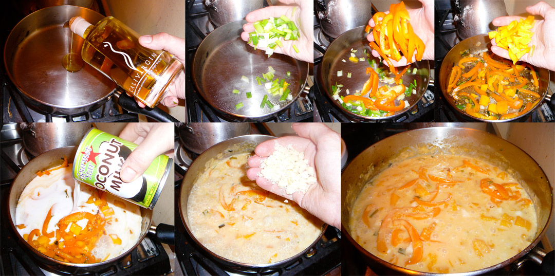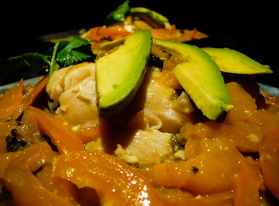 Create the coconut sauce by sautéing the green onions, orange bell peppers and mango in the olive oil until they soften (approx 5 min). Add the coconut milk and macadamia nuts (if you are a superstar) and cook on low heat until the sauce reduces in half (approx 15 min).