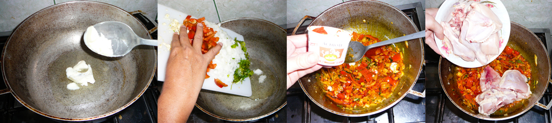 Melt the butter in a large pot on medium-high heat. Throw in the bell pepper, onion, garlic and cilantro and cook until they soften (approx 4 minutes). Add the achiote paste and cook until the veggies go red (approx 2 minutes). Throw in the chicken and cook with the veggies until the skin browns on each side (approx 5 minutes).