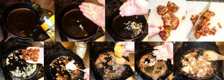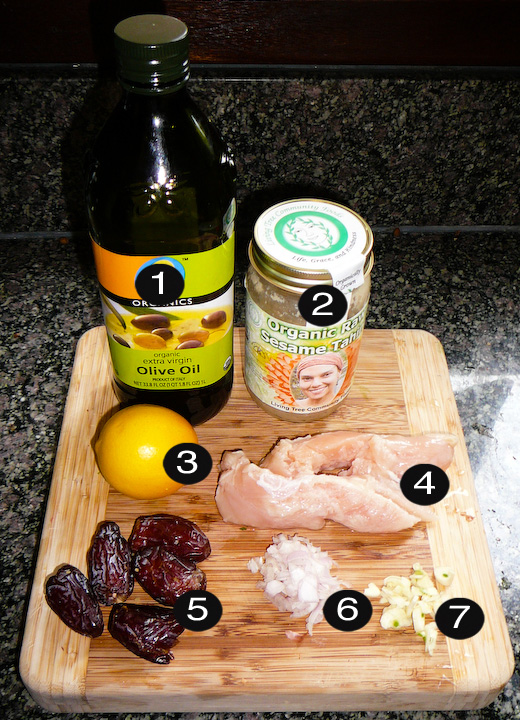 Sauté the garlic and shallots in olive oil on medium heat (approx 1 min). Remove the date pits and chop finely. Throw the dates, tahini, and remaining lemon juice into the pan. Cook until the juice evaporates and it is the consistency of paste (approx 3 min). Add the chicken and cook thoroughly so the sauce coats the meat (approx 4 min).