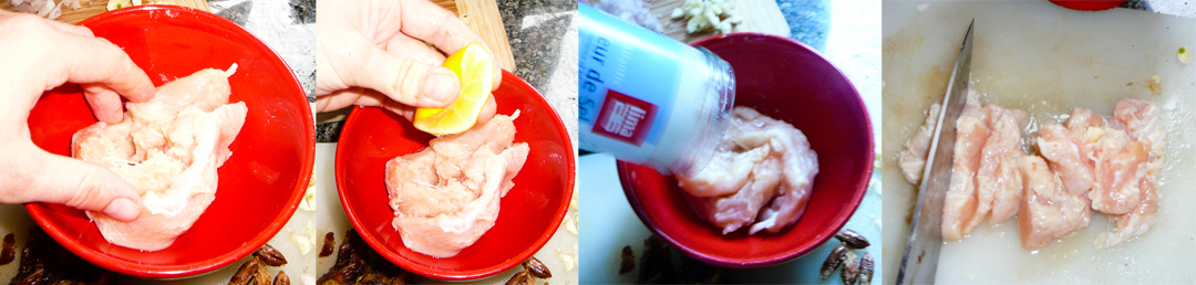 Marinate the chicken in 1/2 lemon of juice and sea salt (approx 10 min). Chop the chicken into bite-sized pieces.