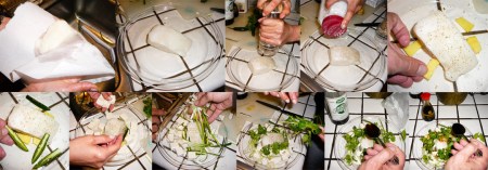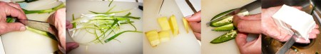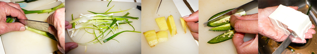 Cut the green onions lengthwise (creates totally different flavor vs. short-wise). Peel the ginger nub and cut into large chunks. Quarter the Serrano chilies. Cube the tofu.