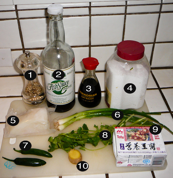 In a wide bowl place the pat-dry fish. Cover in white pepper and salt. Place the ginger, ginger, and chilies around the base of the fish. Scatter the green onions and cilantro above. Spoon in fish sauce and soy sauce.
