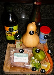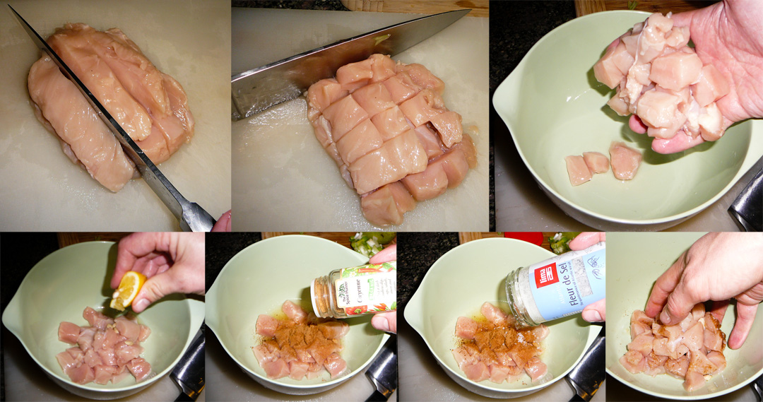 While the squash roasts, cube the chicken and marinate in limejuice, cayenne pepper, and sea salt (approx 10 min).