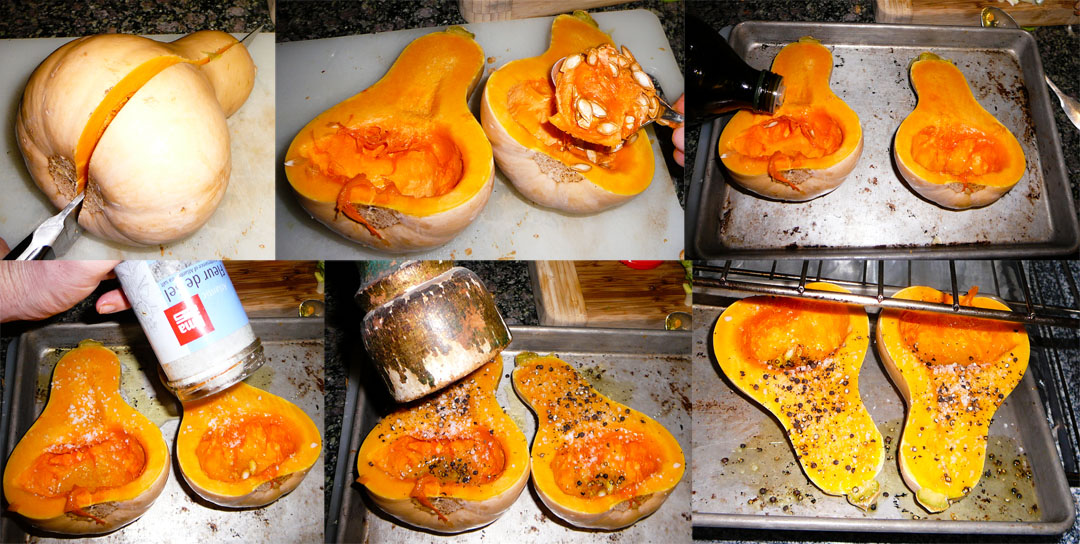 Preheat your oven to 350∞F/175∞C. Slice the squash lengthwise and scoop out the guts, leaving a nice cavity. Rub olive oil into each half, and then salt and pepper them and roast until the squash meat is soft (approx 30 min).