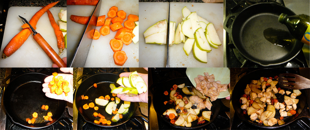 Peel the carrots and chop into bite-sized pieces. Slice the pears thinly. SautÈ the carrots and pears until they soften (approx 5 min). Add the chicken and sautÈ thoroughly.