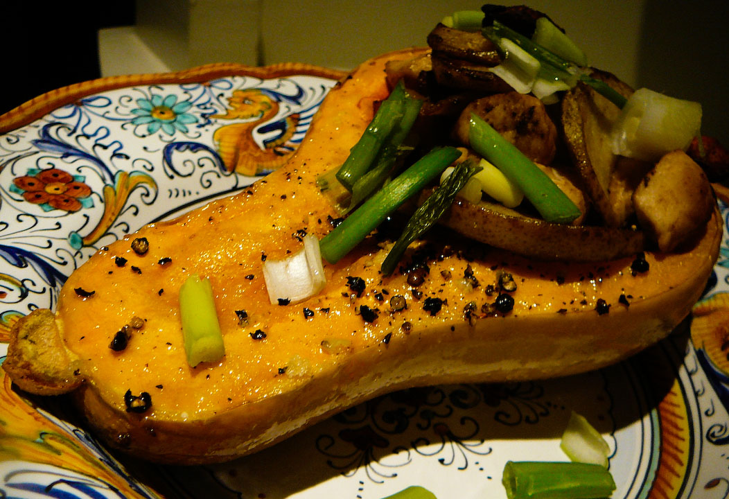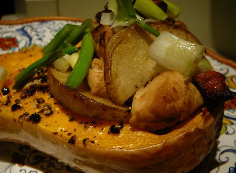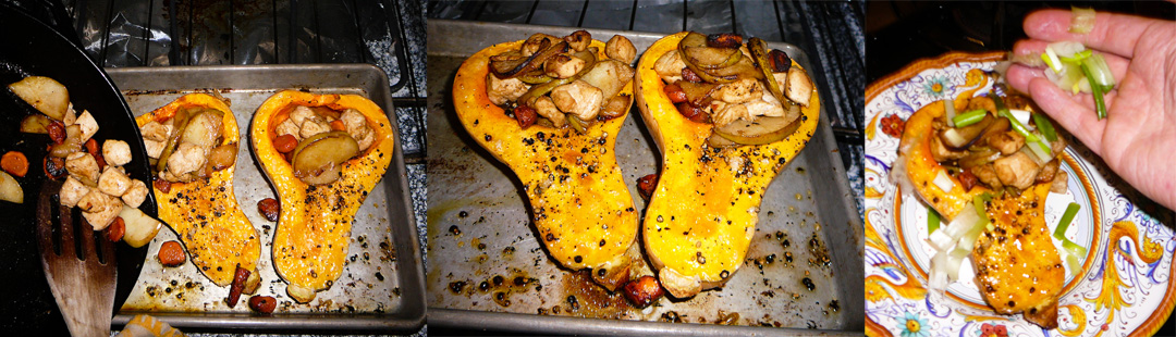Finally scoop the sautÈed chicken and veggies into the cavities of the squash (once soft) and throw back in the oven and roast until it’s all heated through (approx 5 min). Crown each with green onions and serve.