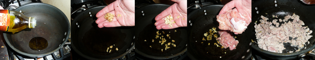 First brown the chicken. Add ½ a tablespoon of olive oil to a pan on medium heat. Throw in the ginger, then garlic and cook them solo until they begin to brown (approx 1 minute). Finally toss in the minced chicken in and cook them in the garlic and ginger until the meat goes grayish-white (approx 3 minutes). Set aside.