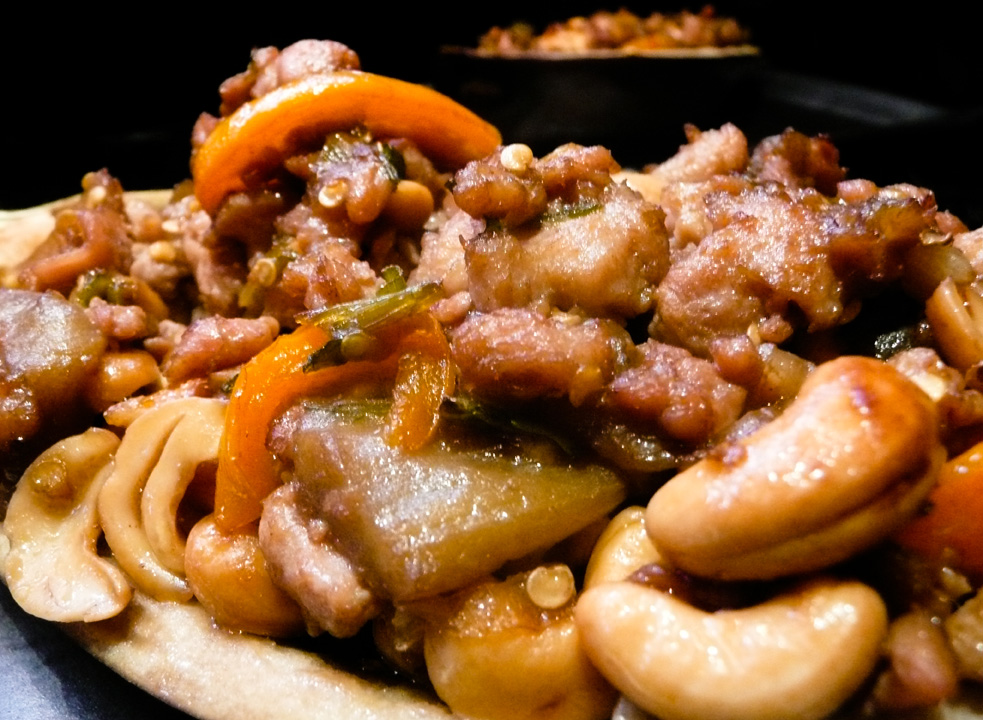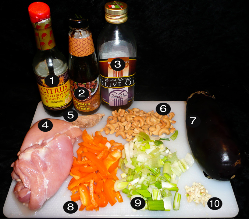 Pour the other ½ tablespoon into the pan and immediately toss in the green onions and bell peppers and stir-fry until they soften (approx 2 minutes). Throw in the eggplant meat and smother it in the oyster sauce and cook until the eggplant becomes mushy (approx 2 minutes). Toss in the chicken and throw in the soy sauce and cashew nuts and meld the flavors (approx 2 minutes).
